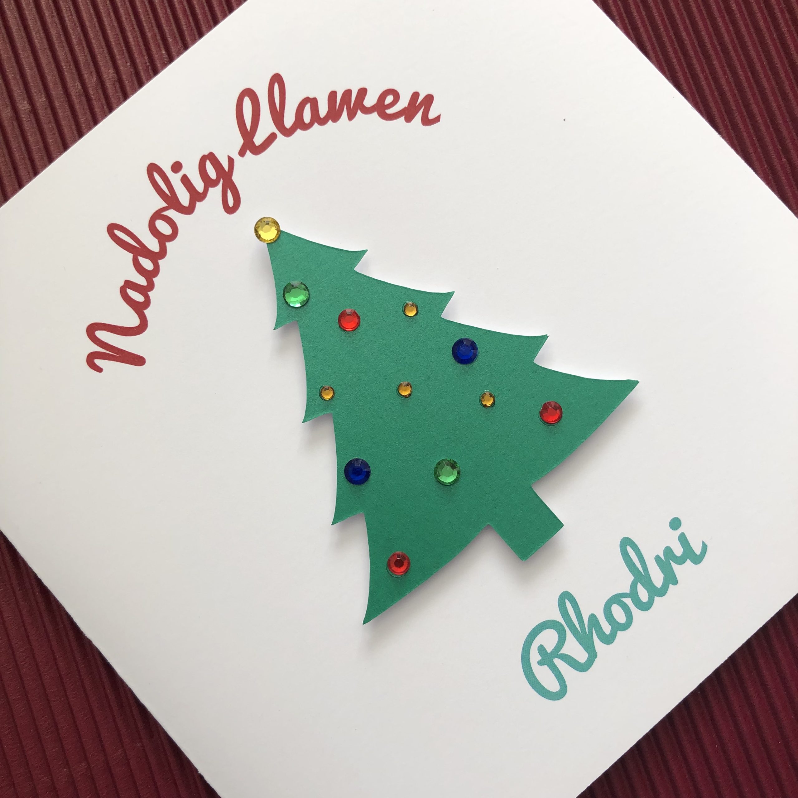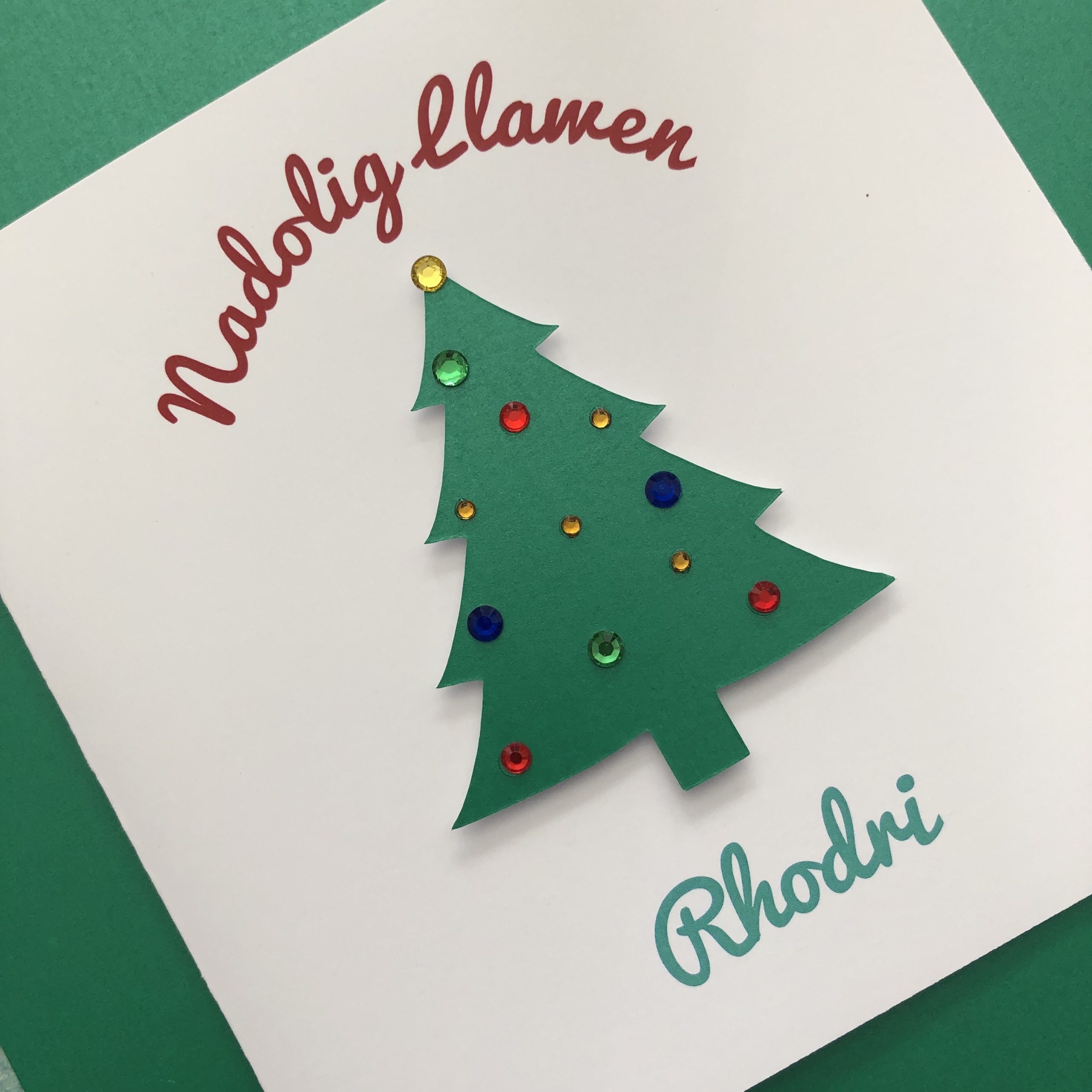 The wording reads ‘Nadolig Llawen’ (Merry Christmas) above the tree with the recipient’s name/s underneath.