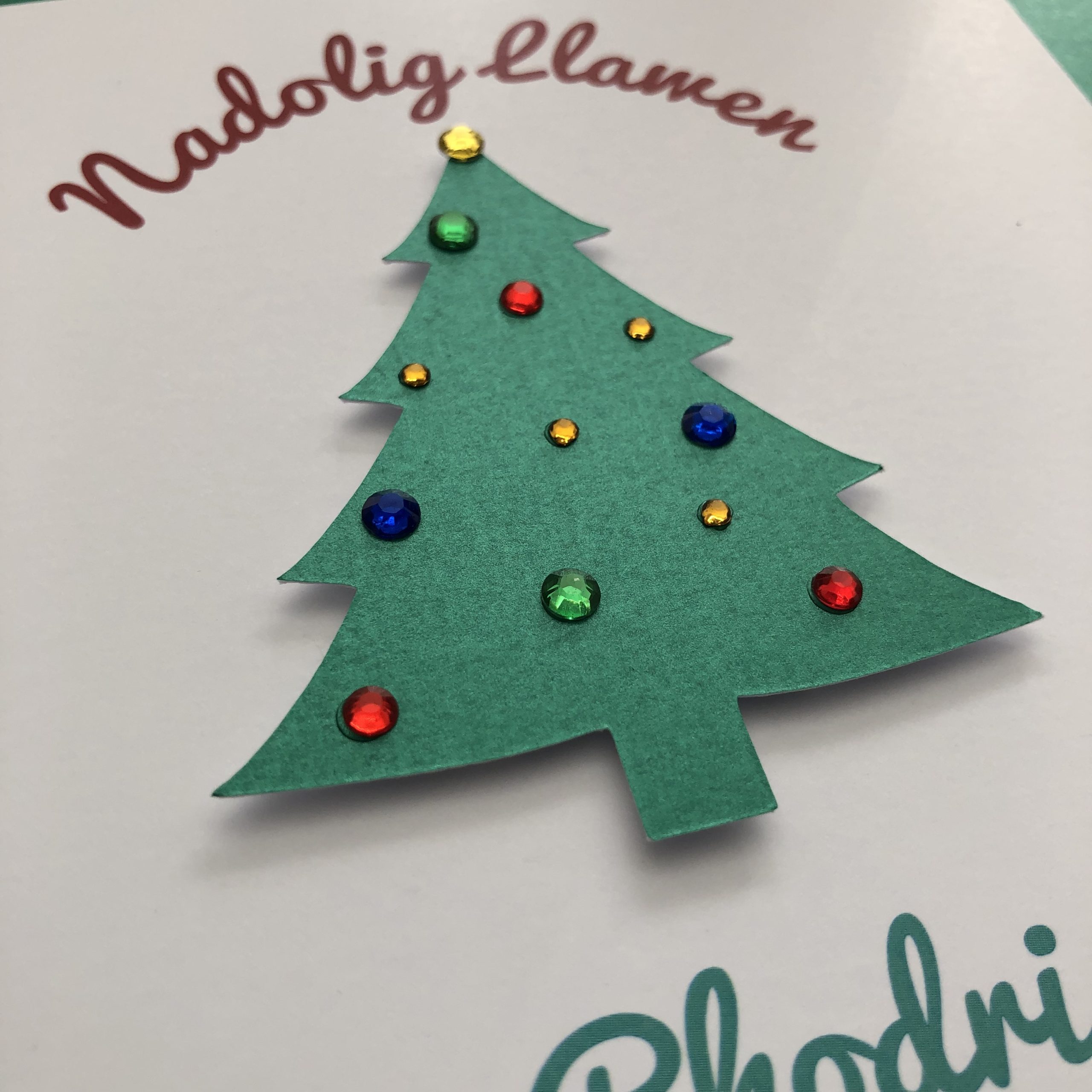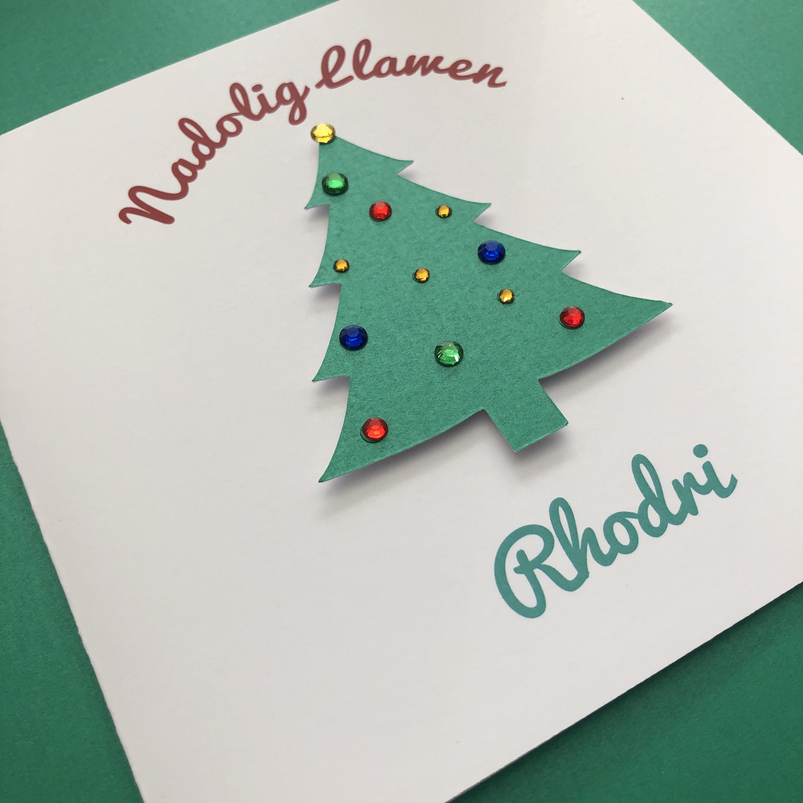 A Welsh language Christmas card featuring a pearly green Christmas tree embellished with diamanté gems for that extra sparkle!
