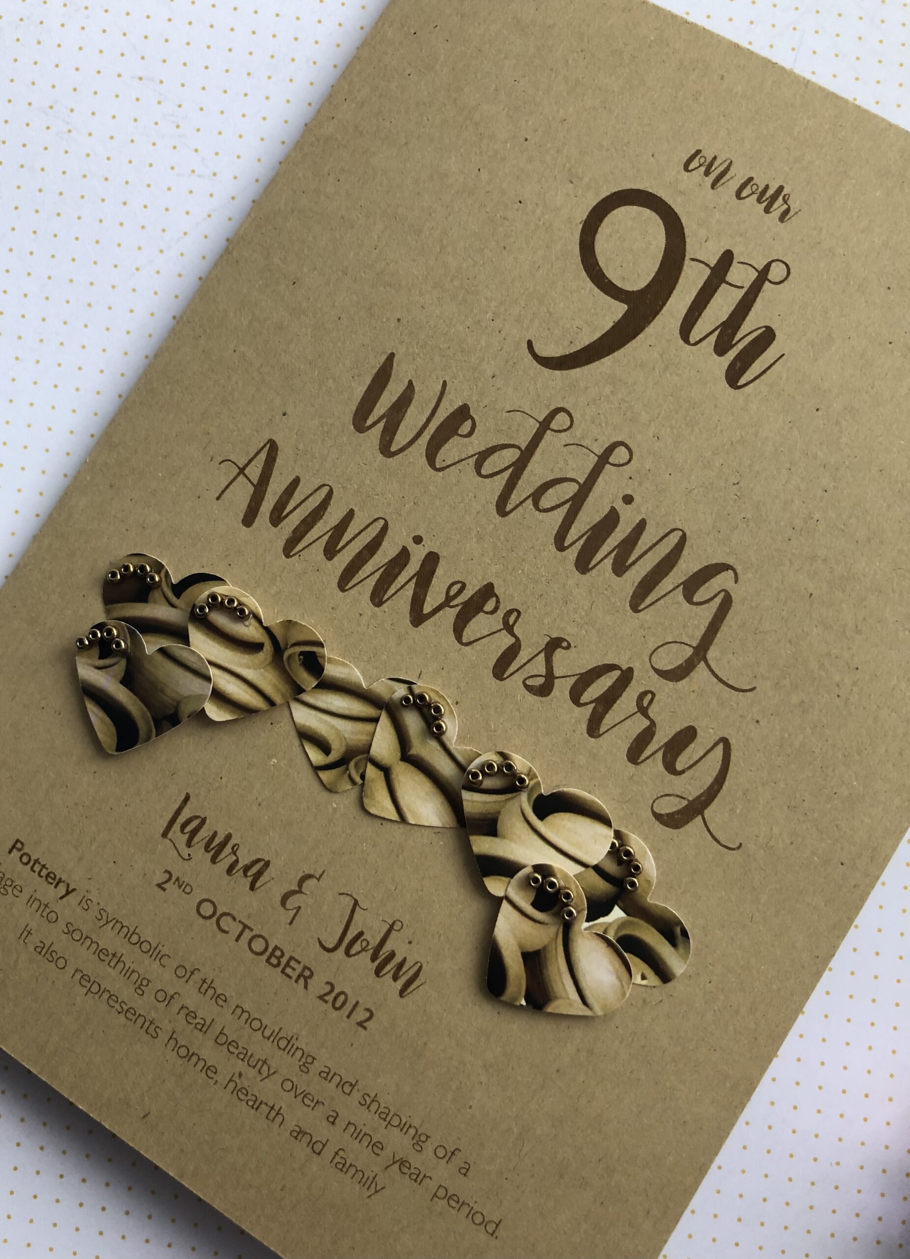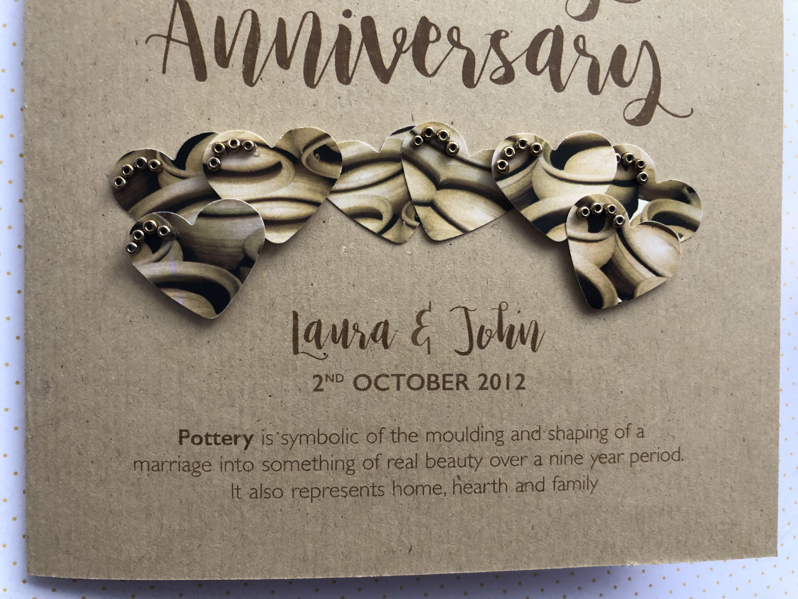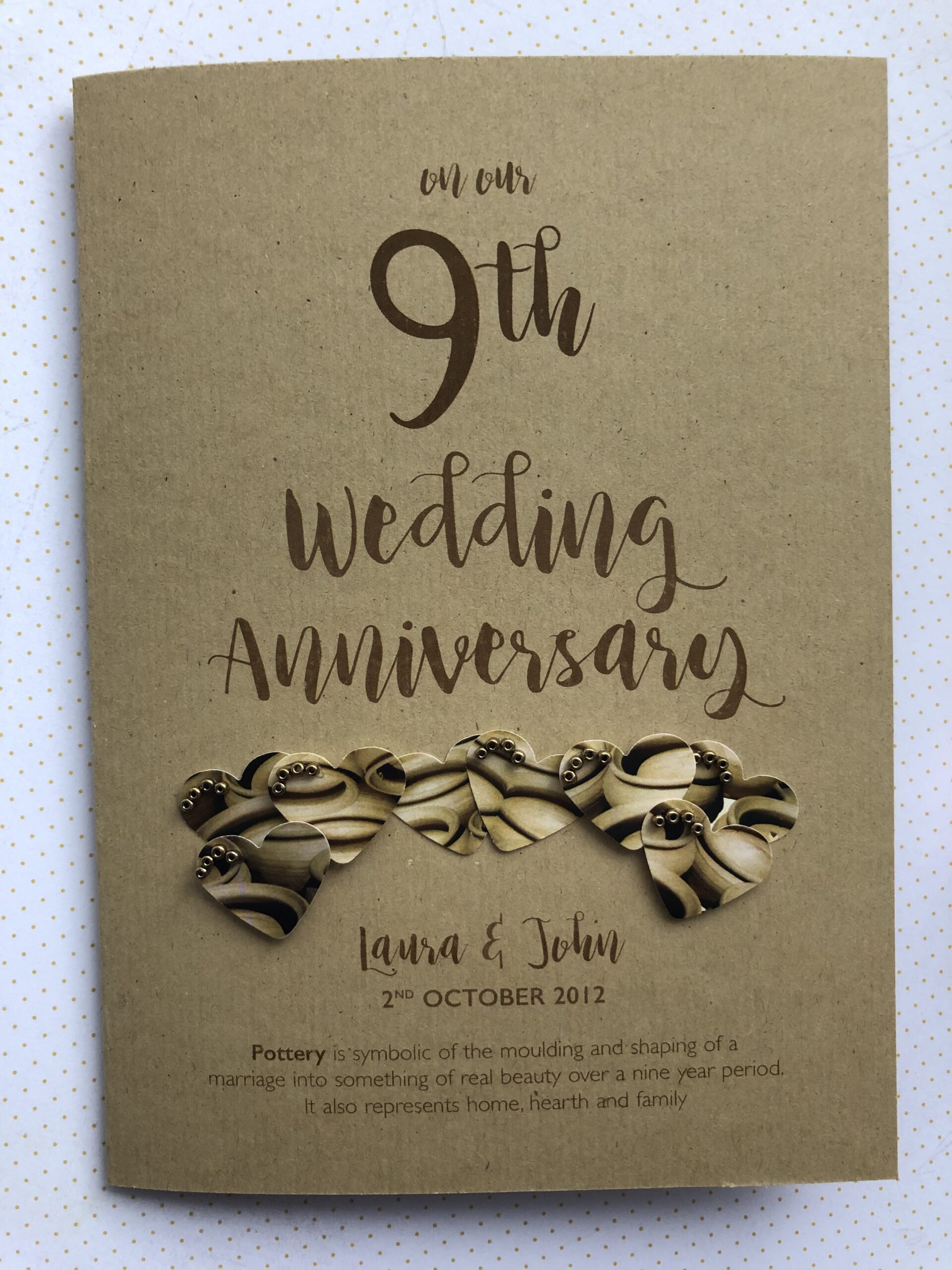 A beautiful keepsake anniversary card for a Pottery (9th) wedding anniversary. Hand crafted to order with the utmost care and attention.