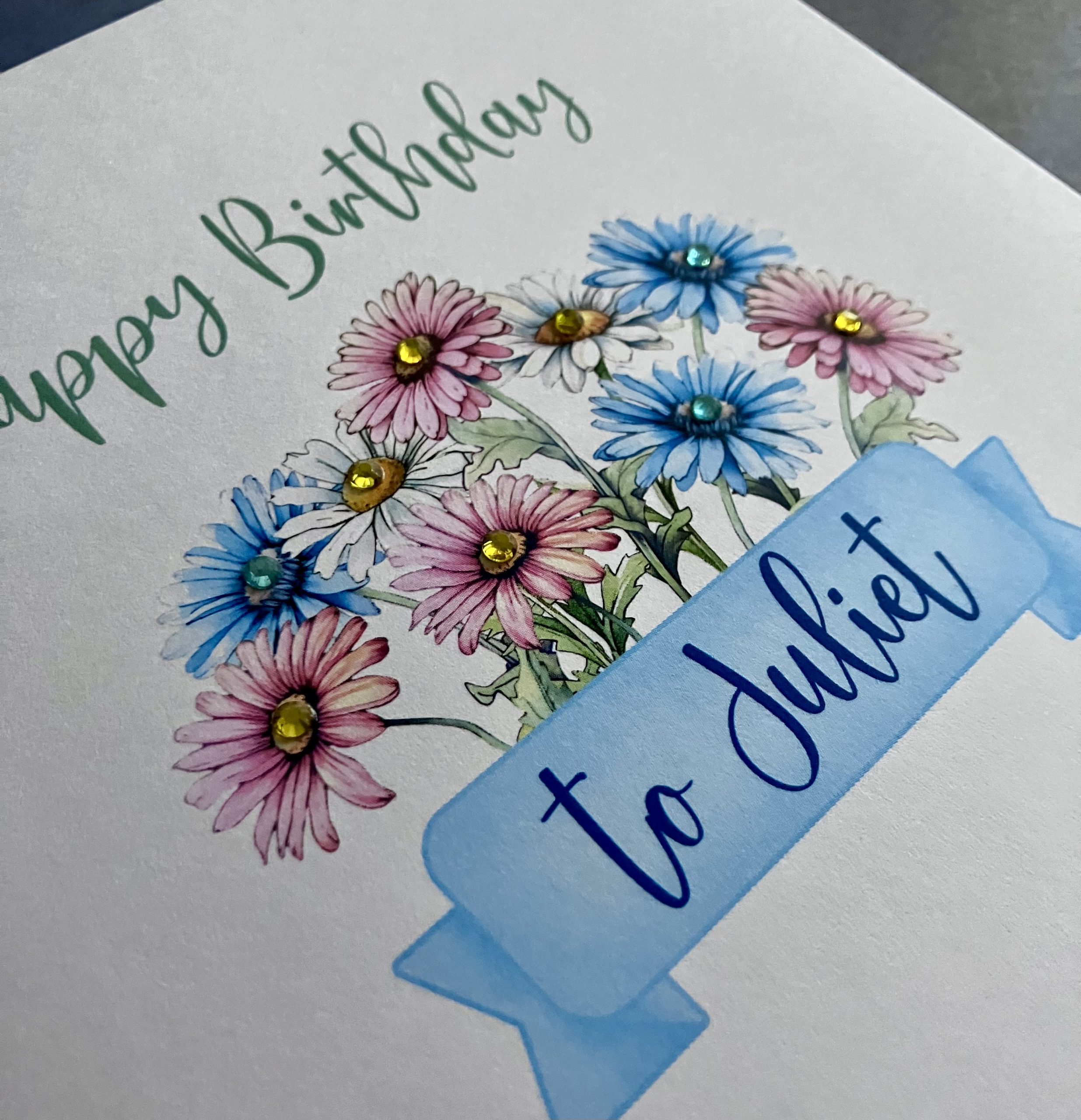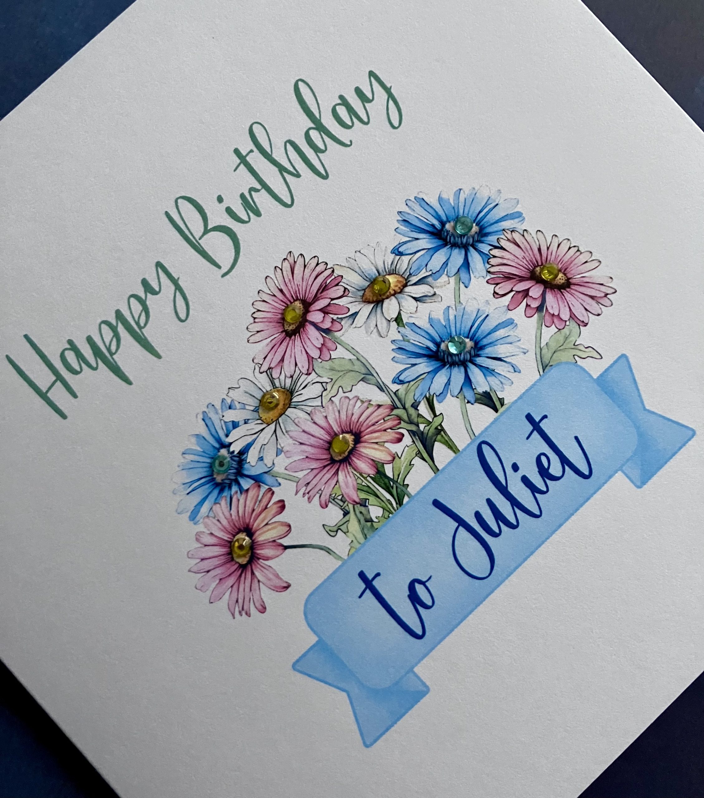 A square white greetings card featuring an illustration of Daisies – the birth flower for April – embellished with diamanté gem accents. Each card is personalised with the name of the recipient.
