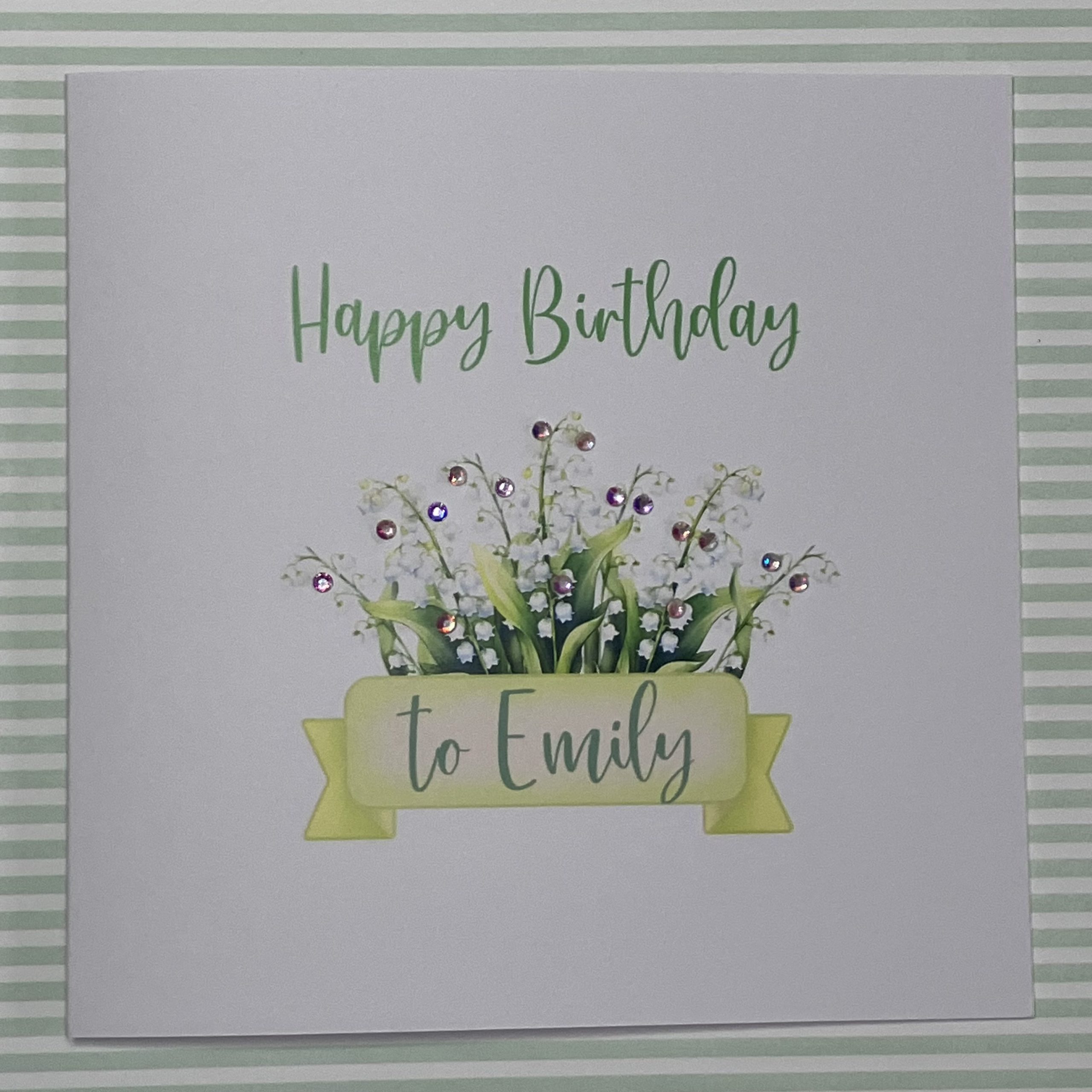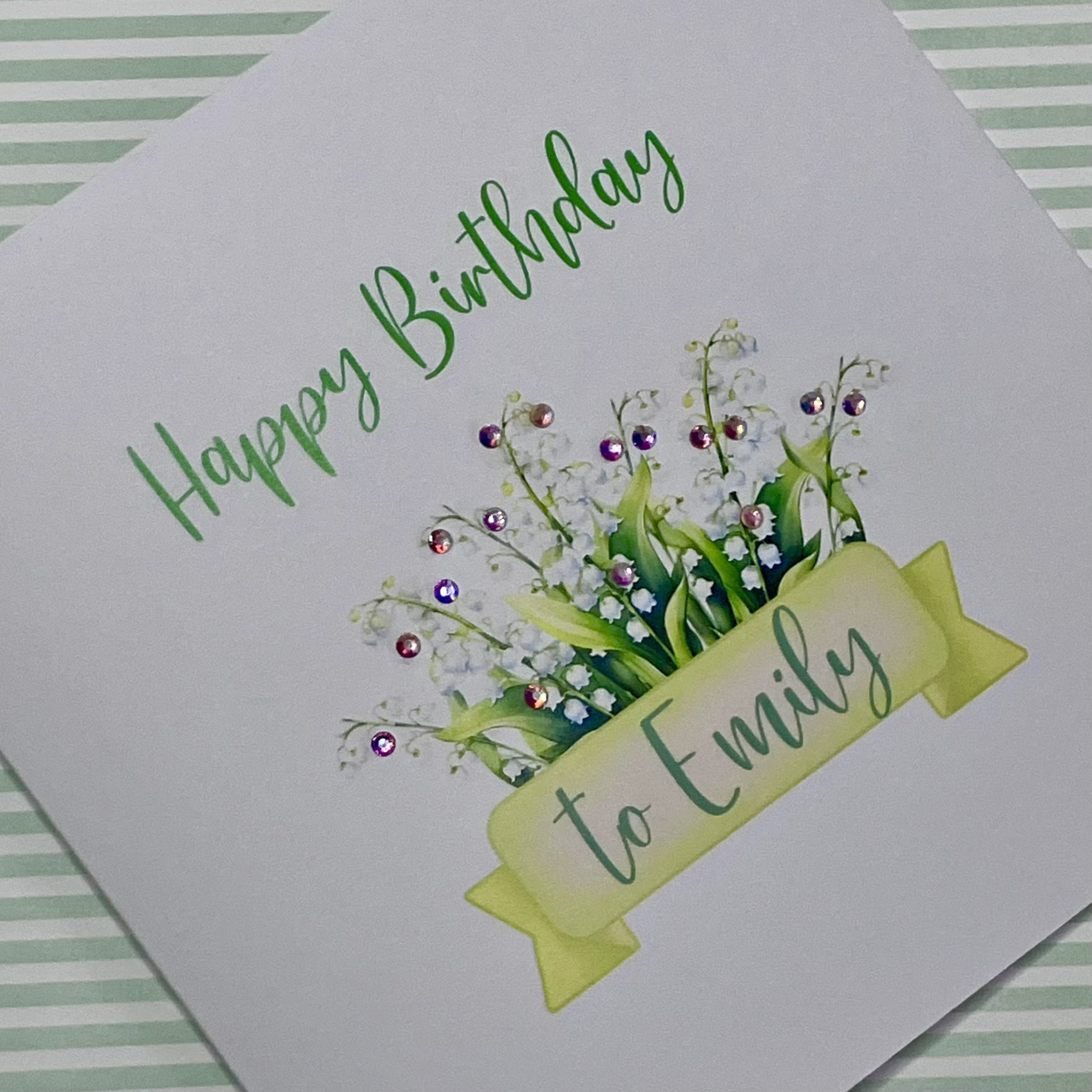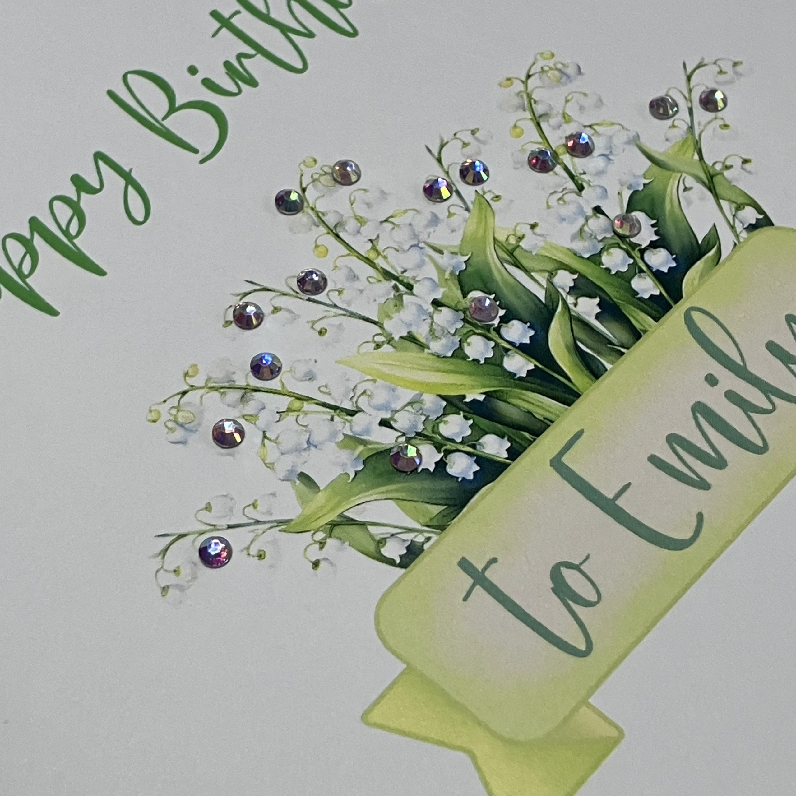 A square white greetings card featuring an illustration of Lily of the Valley – the birth flower for May –  embellished with diamanté gem accents. Each card is personalised with the name of the recipient.