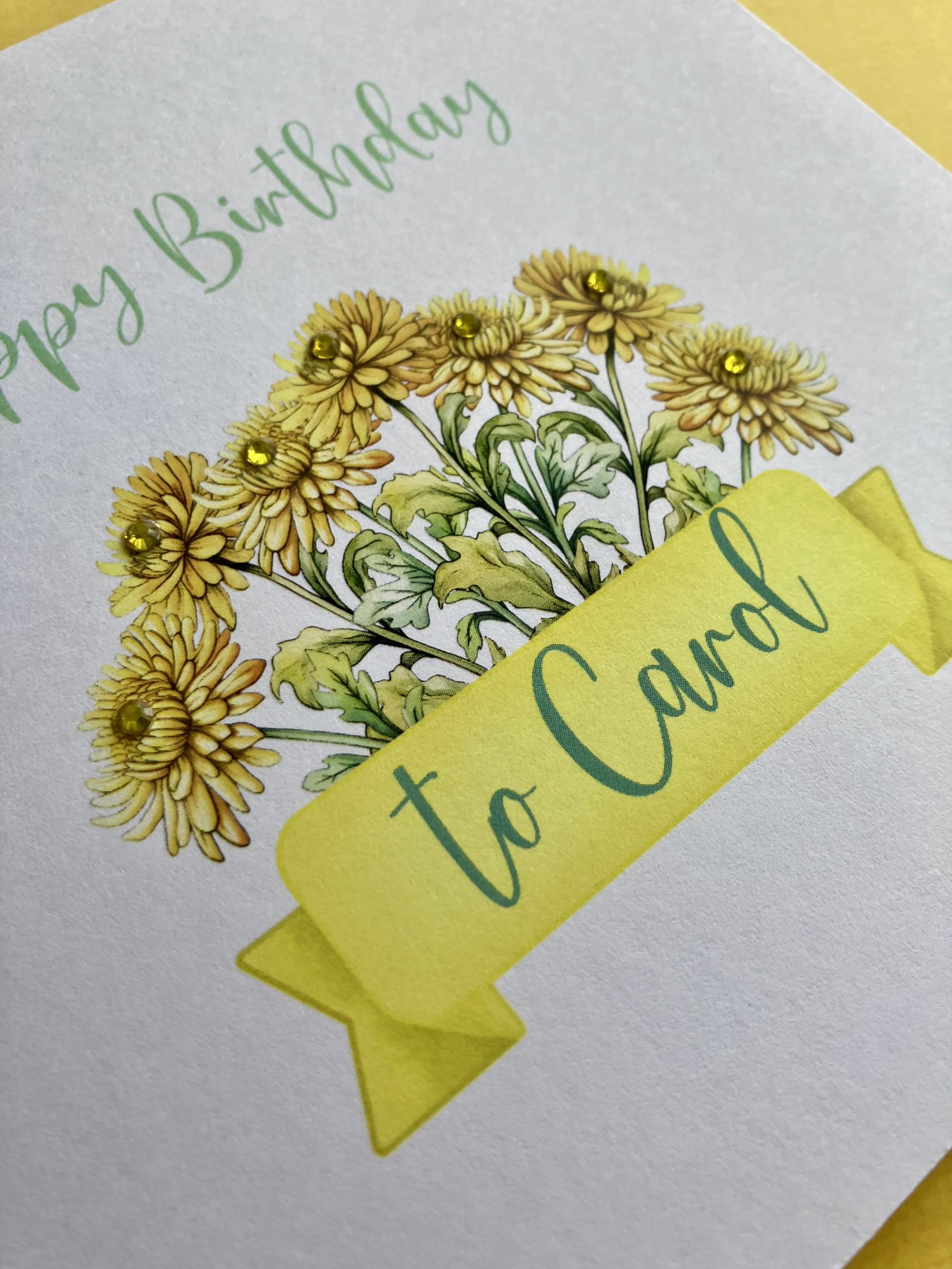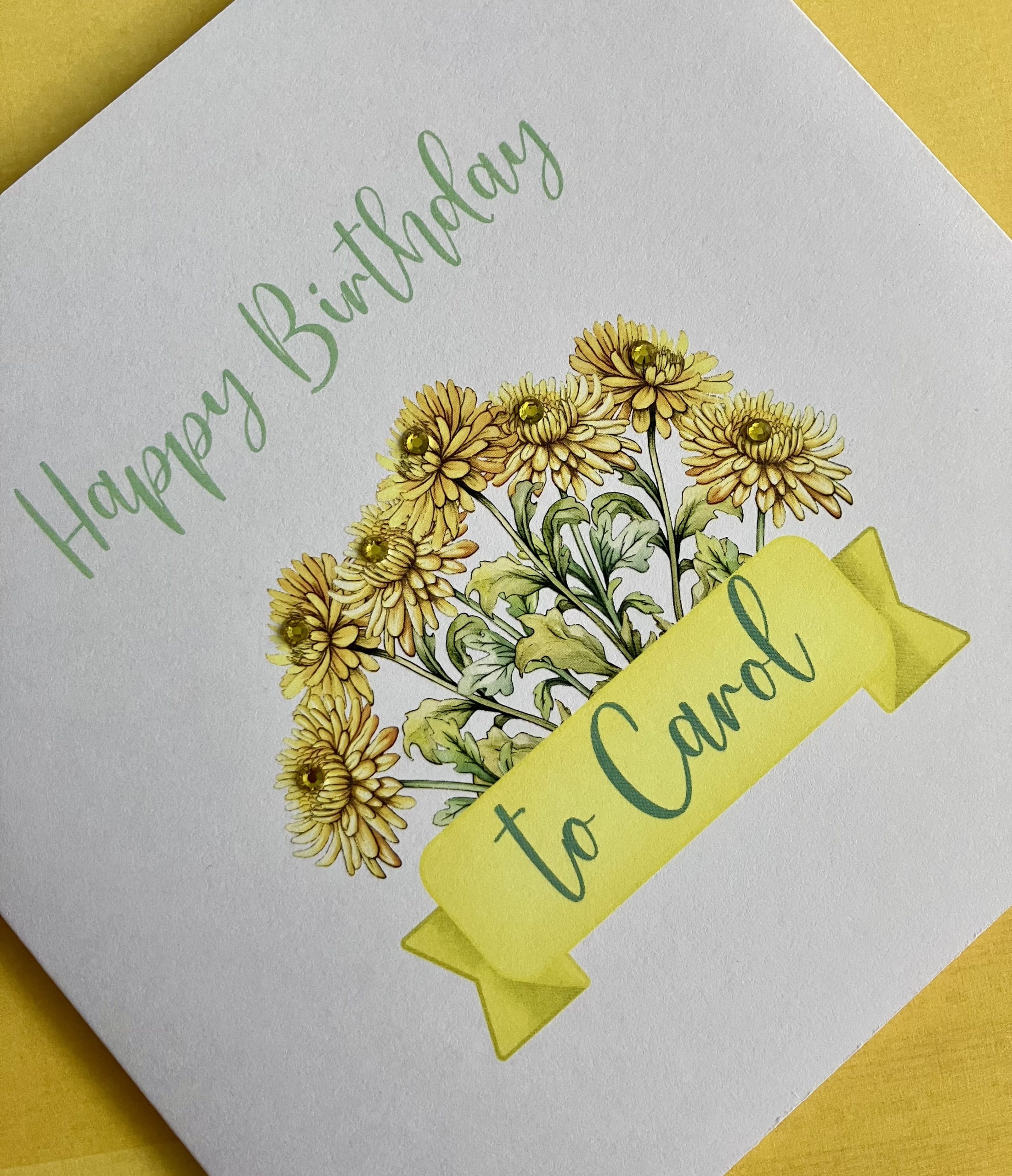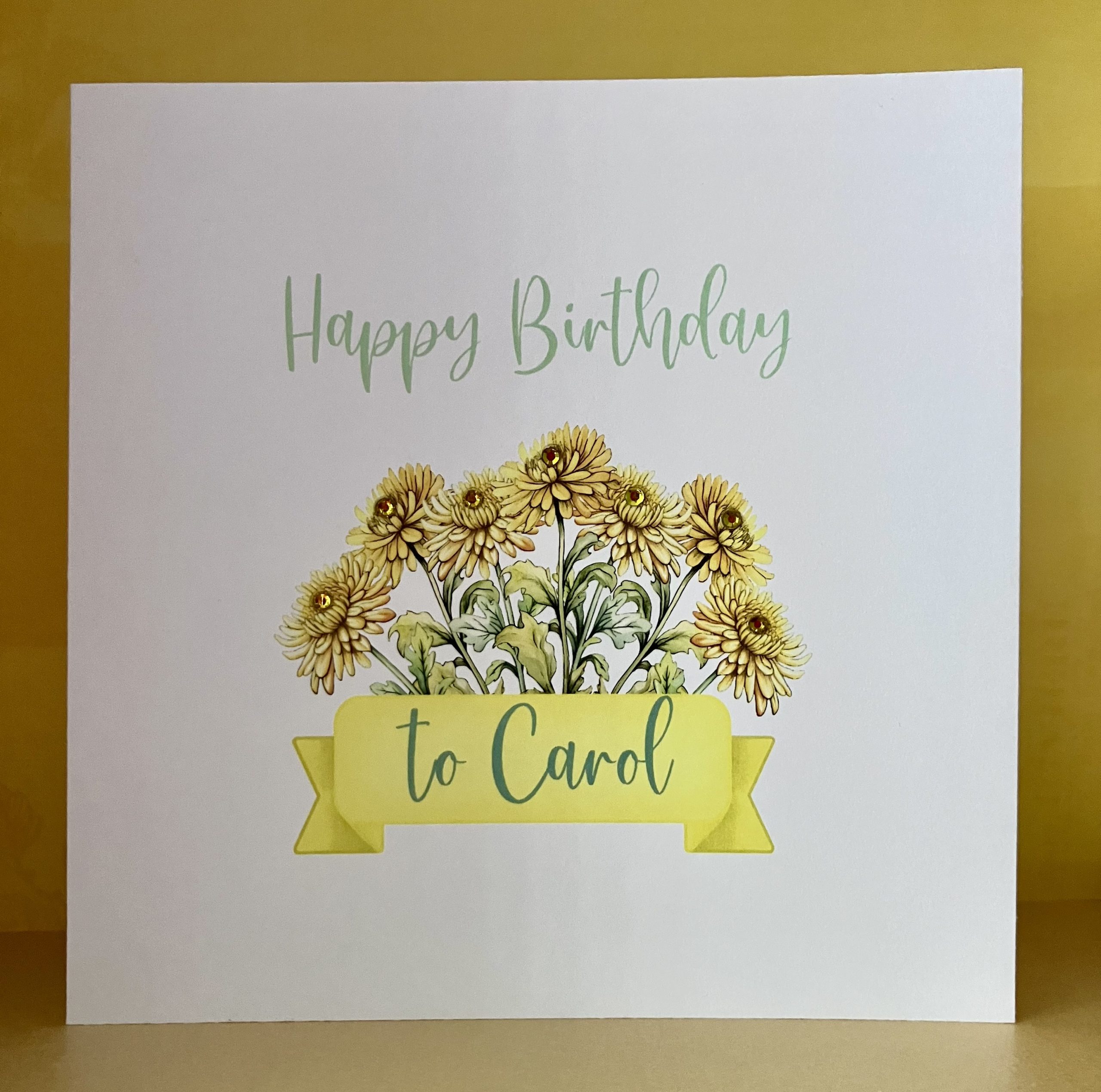 A square white greetings card featuring an illustration of Crysanthemums – the birth flower for November – embellished with diamanté gems. Each card is personalised with the name of the recipient.