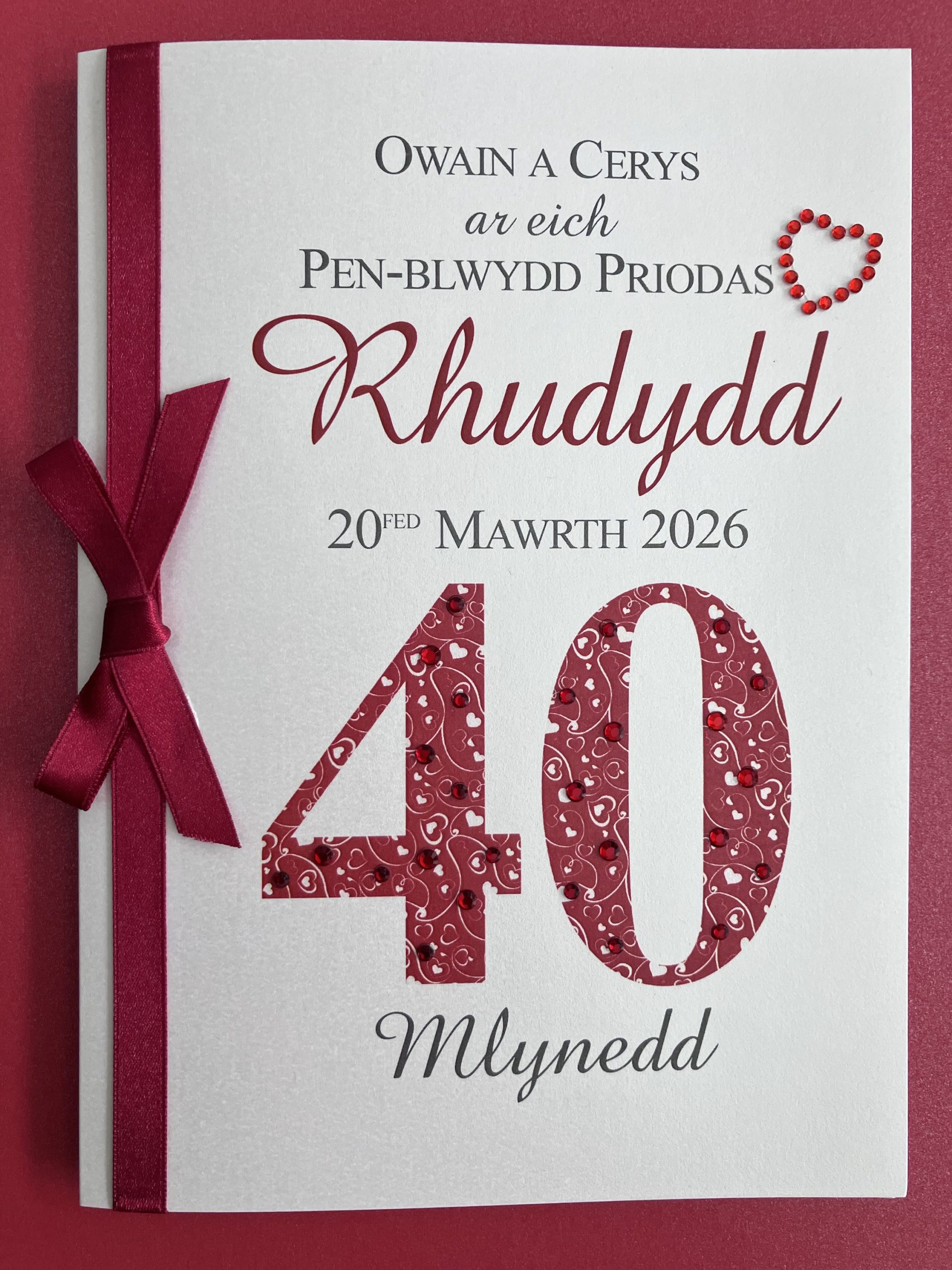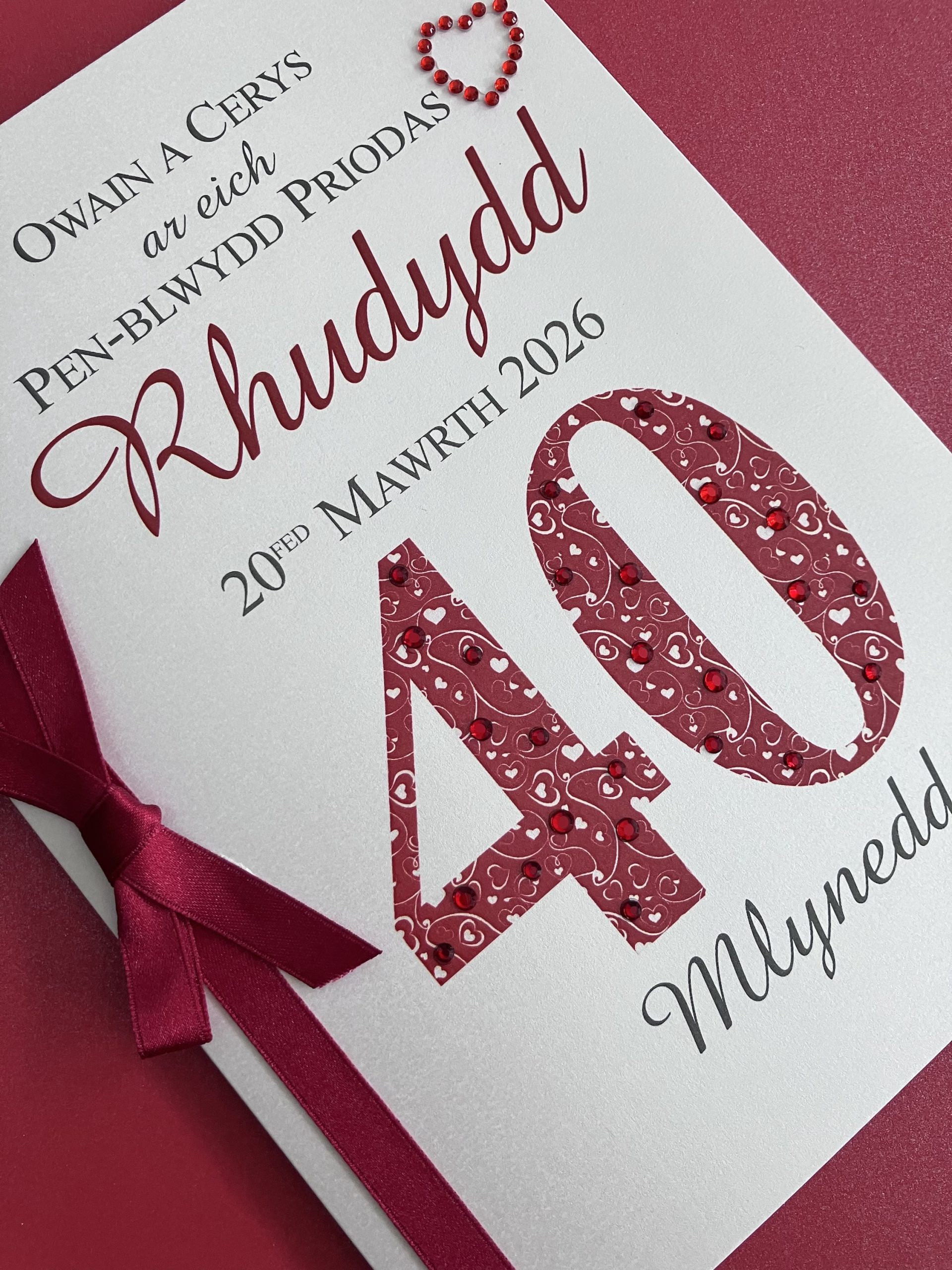 A large shimmering greeting card featuring a romantic heart-patterned ’40’ which is festooned with diamanté accents. The card is finished with a luxurious ruby red colour ribbon bow.