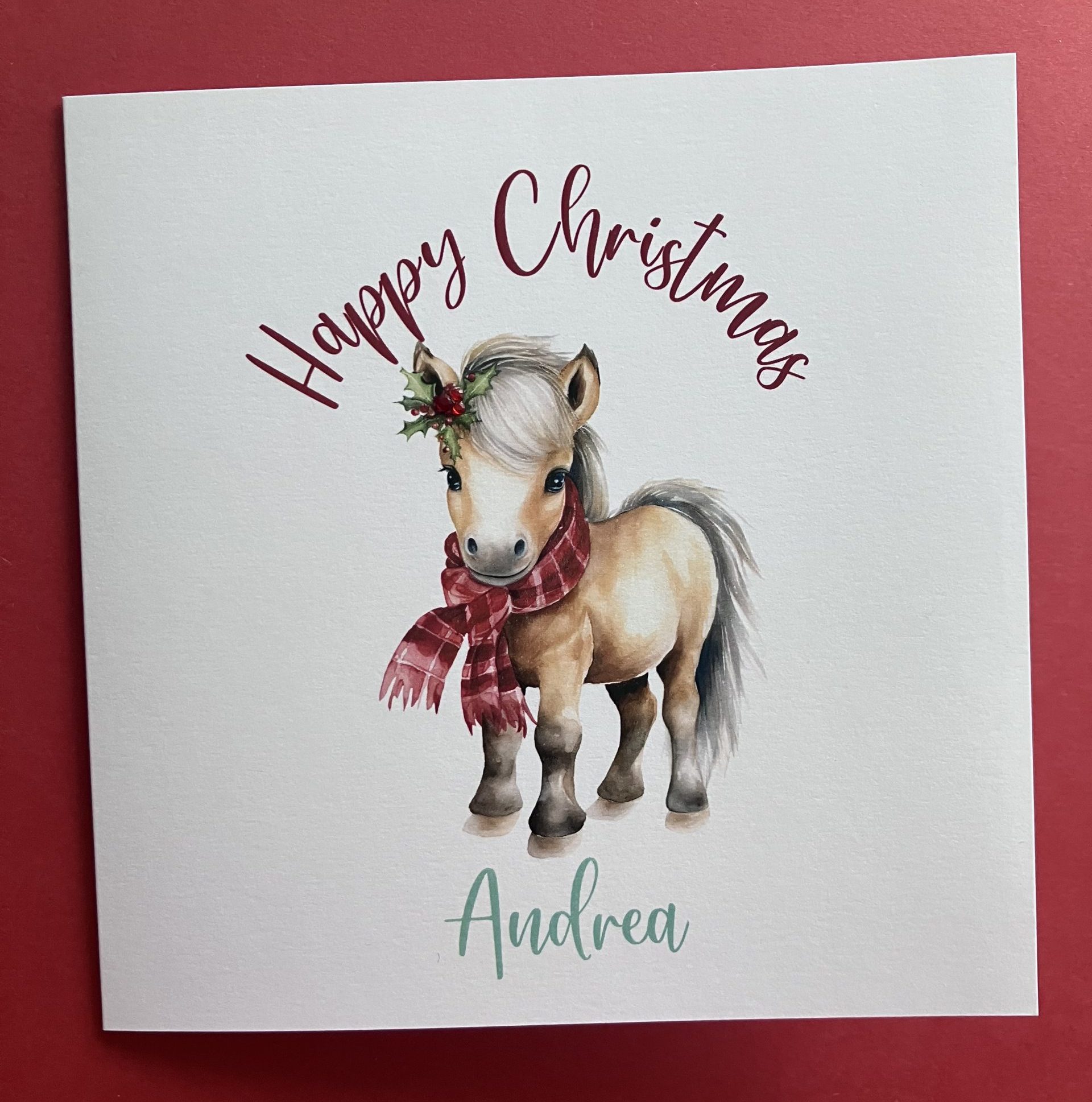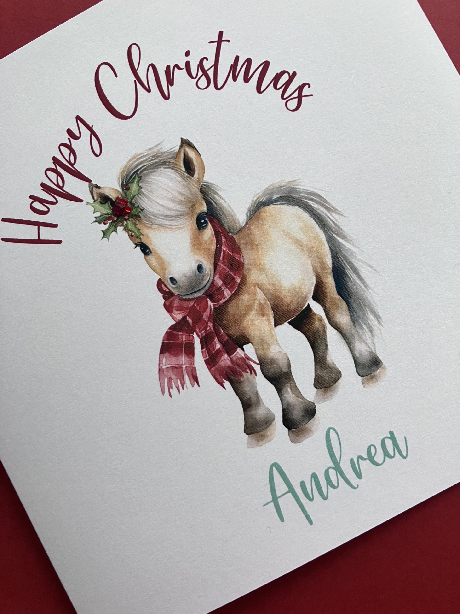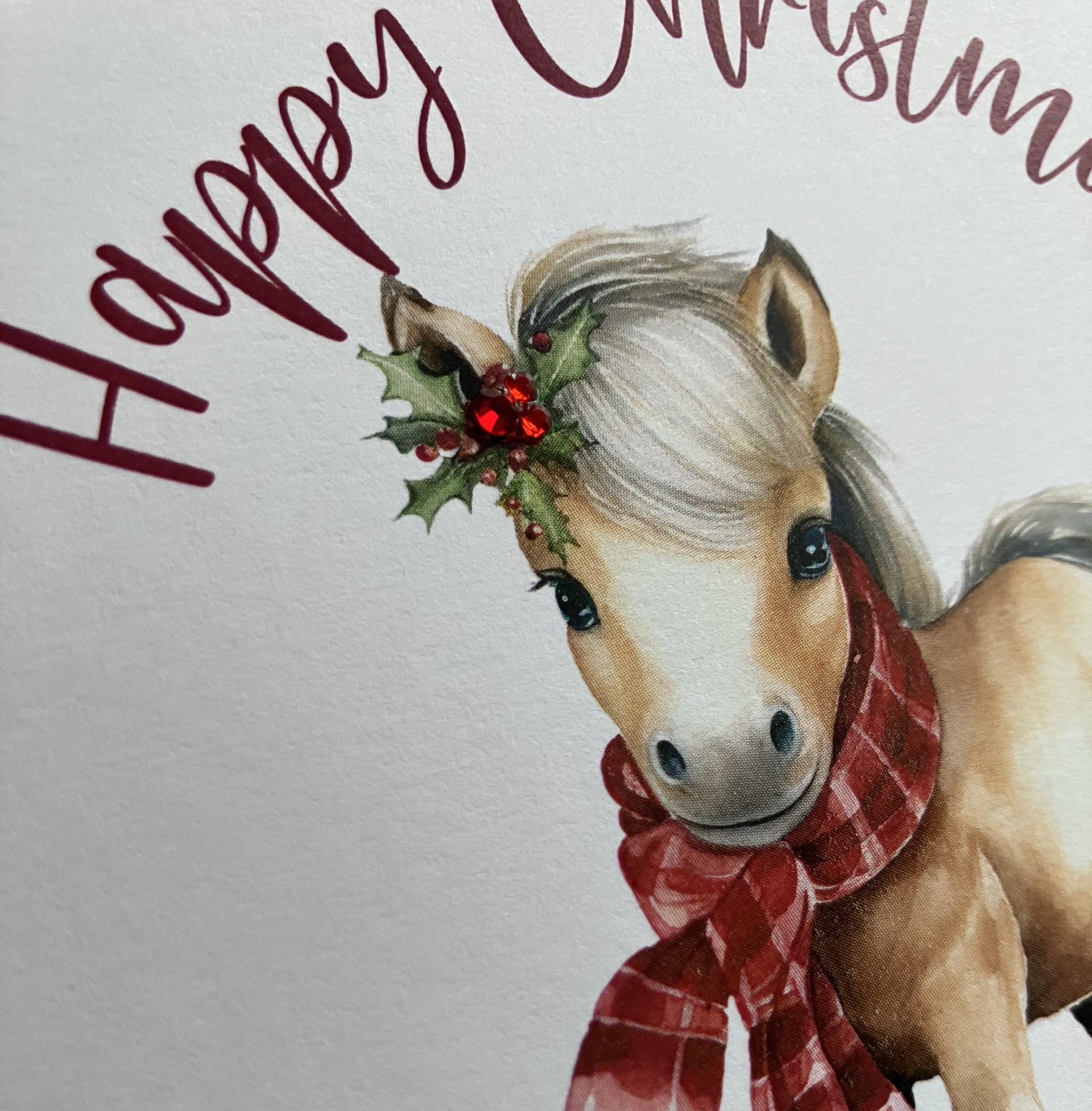 A Happy Christmas card featuring an illustration of a cute pony, wrapped up in a winter scarf and festive holly – embellished with diamanté gems for that extra sparkle!
