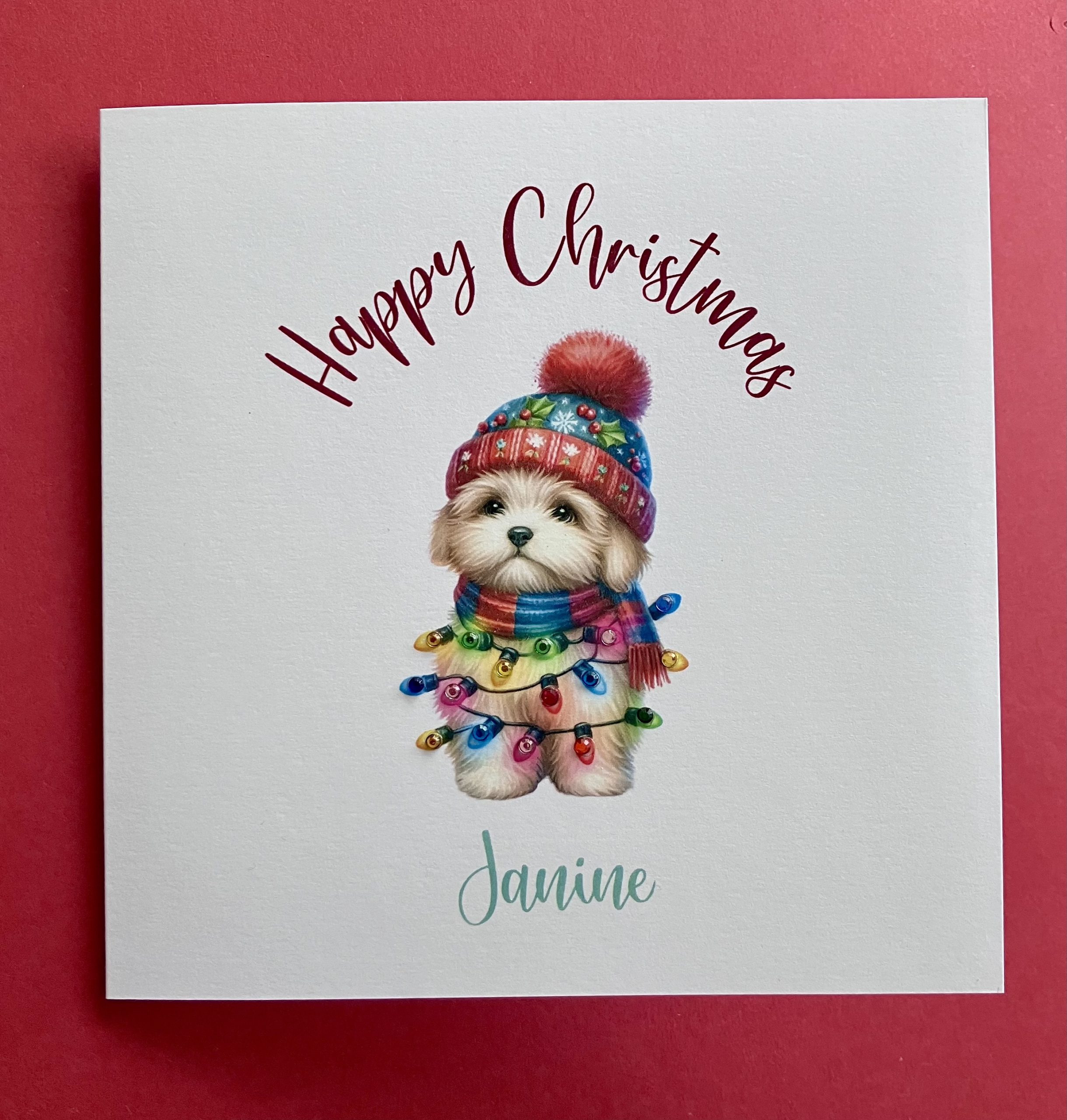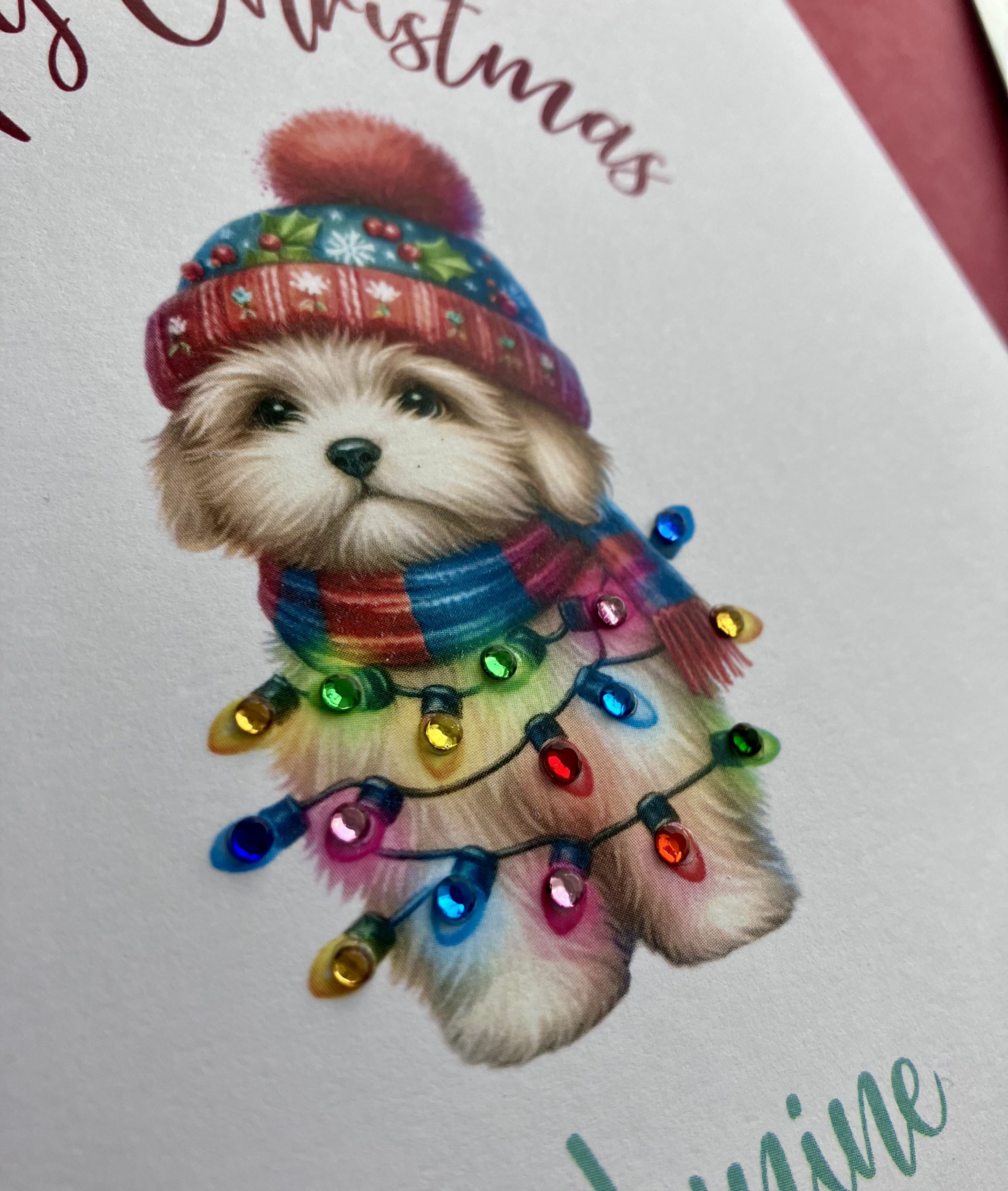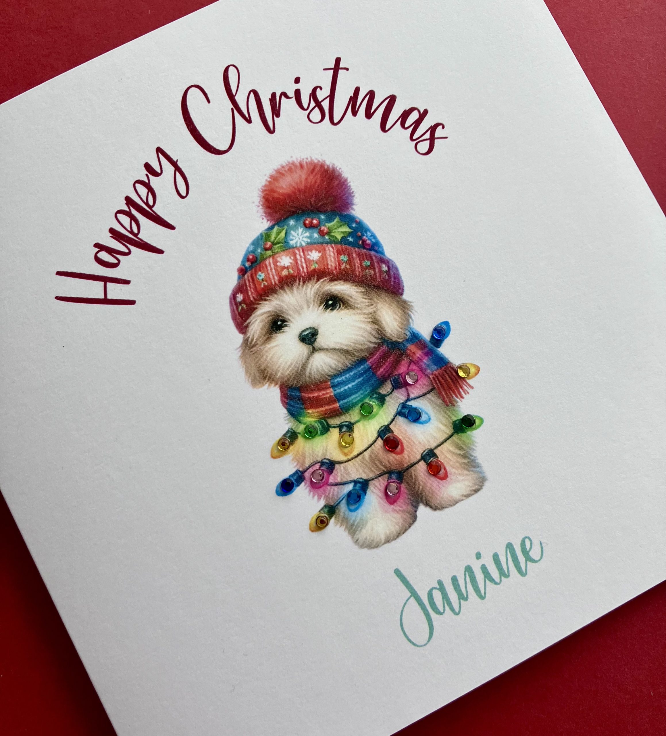 A Happy Christmas card featuring an illustration of a cute puppy in a red hat, tangled in fairy lights embellished with diamanté gems for that extra sparkle!