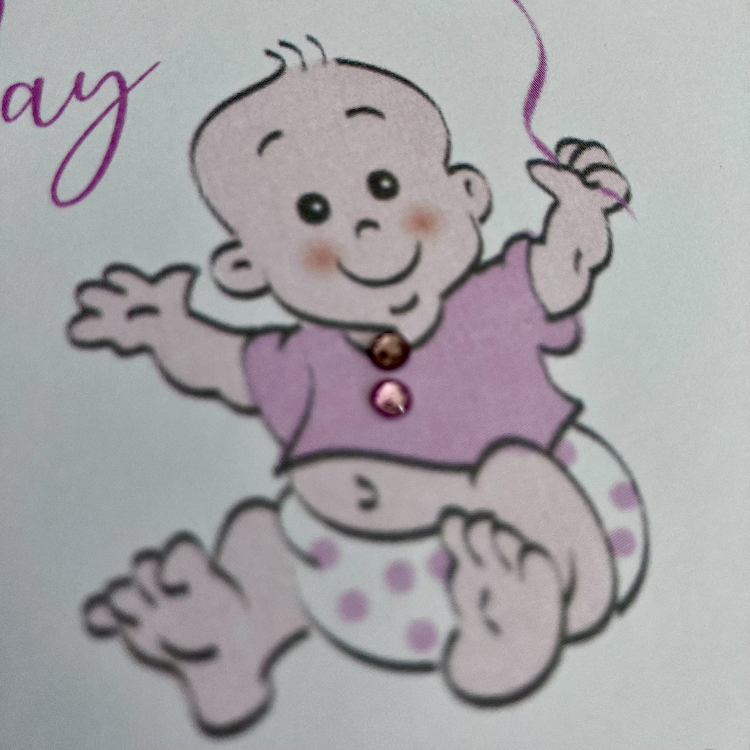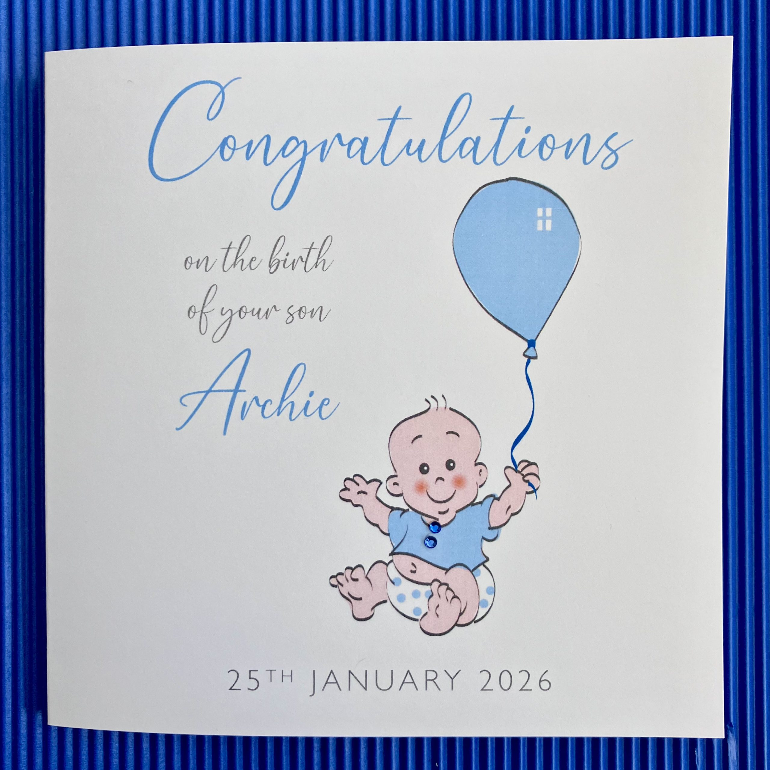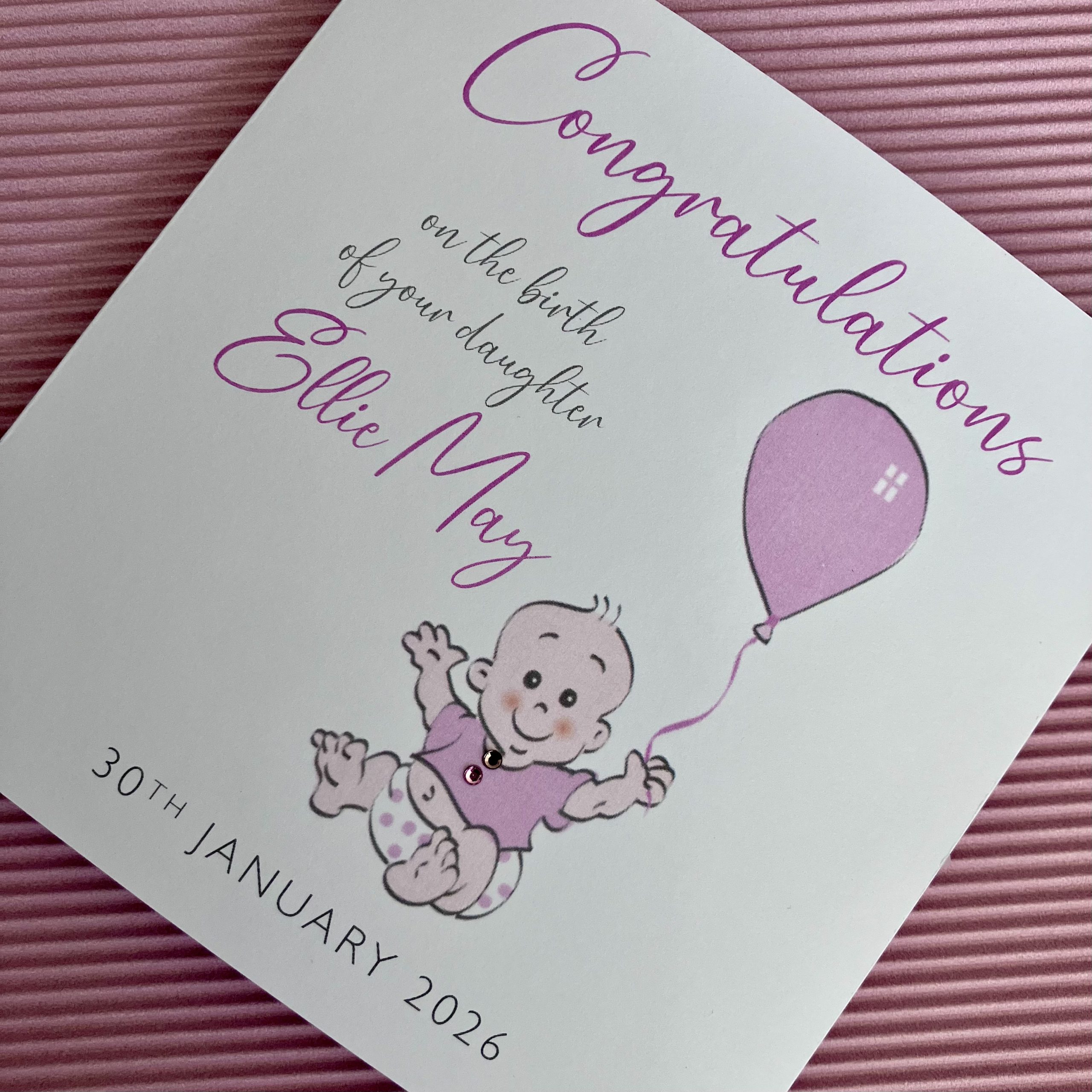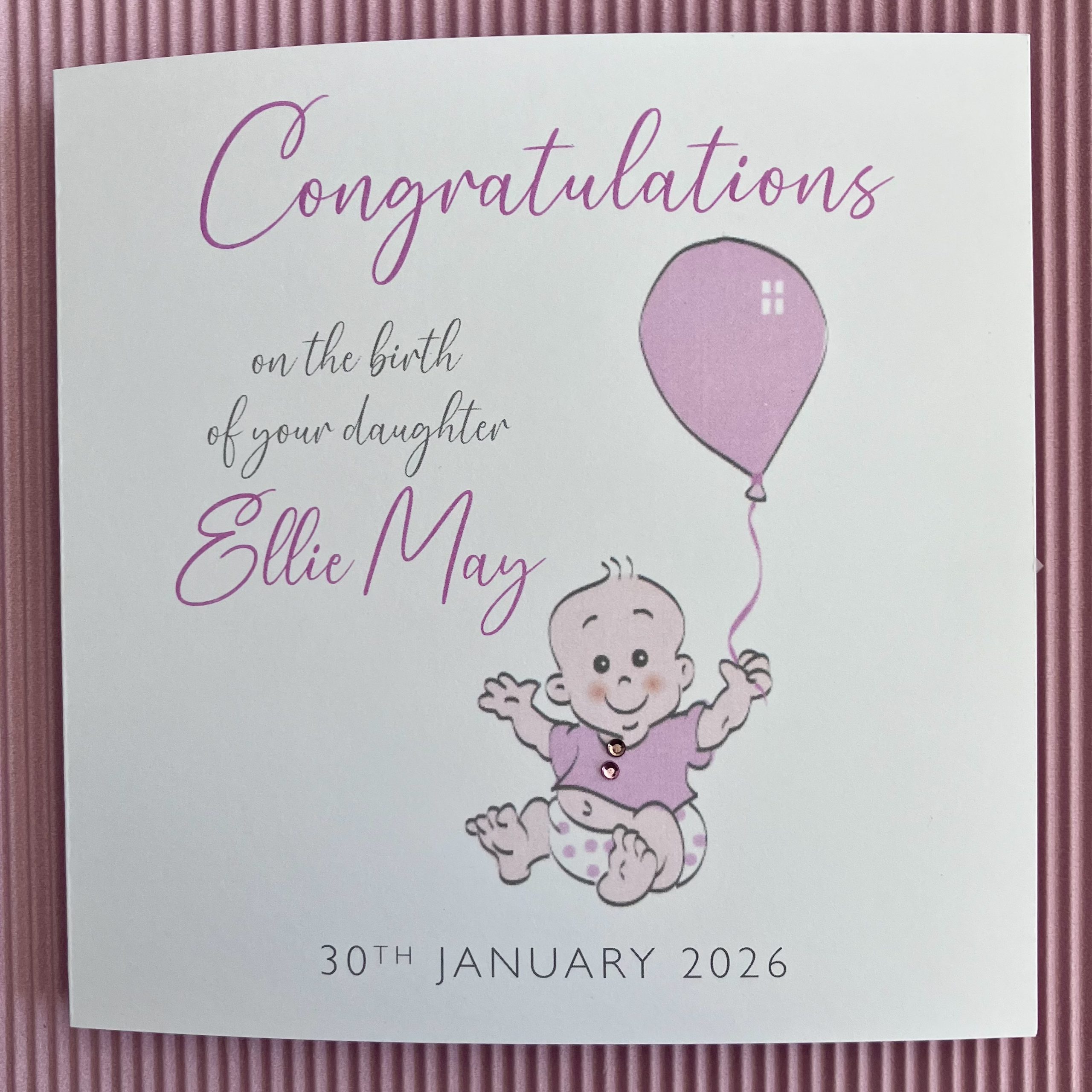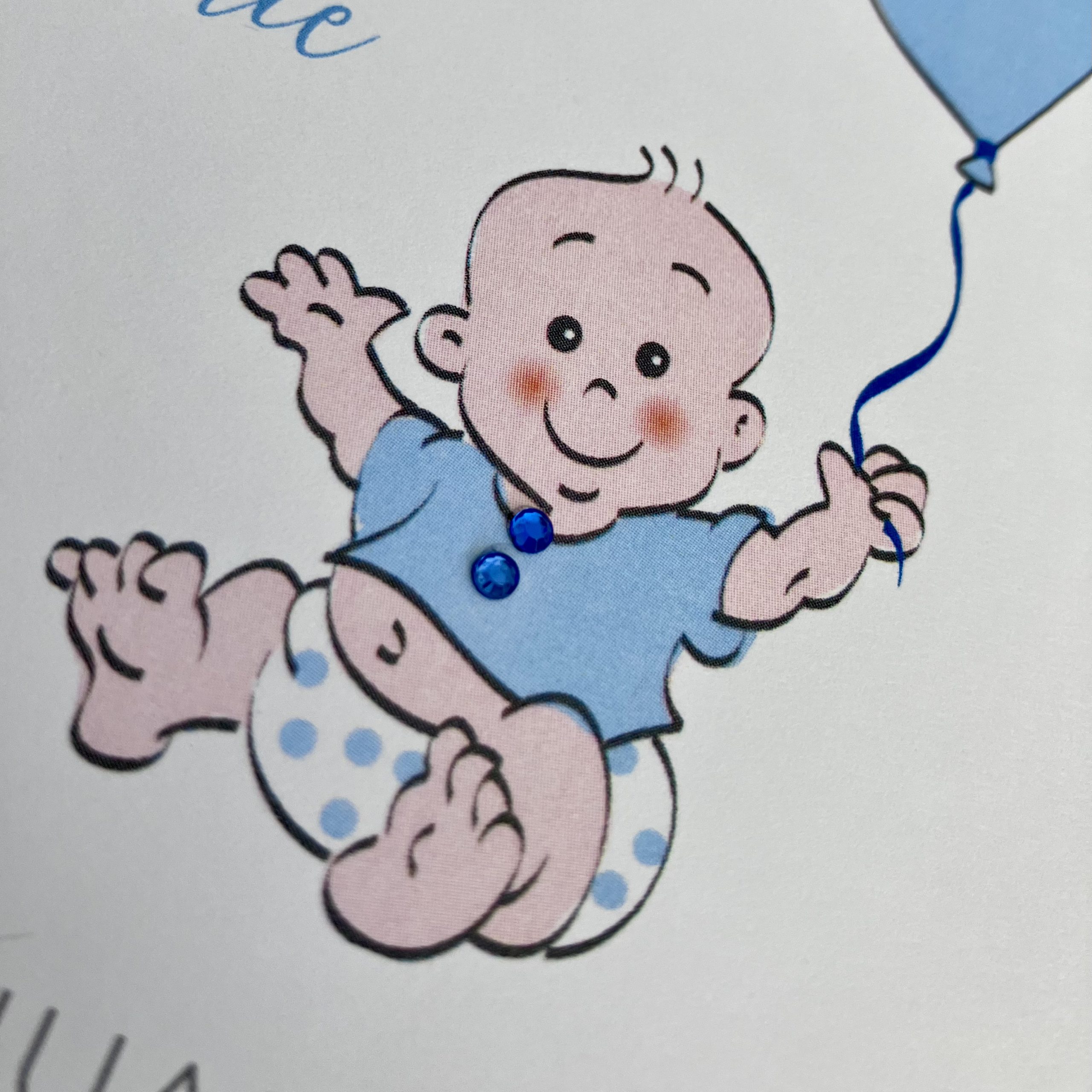 A pretty new parents congratulations card featuring my own artwork of a baby boy or girl holding a balloon. Baby’s name and birth date are printed alongside and underneath. The baby’s top is embellished with blue or pink diamanté gems.