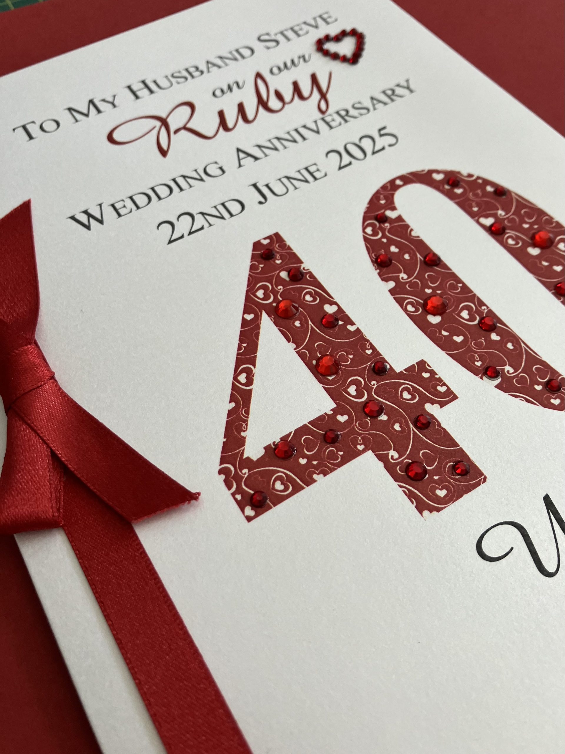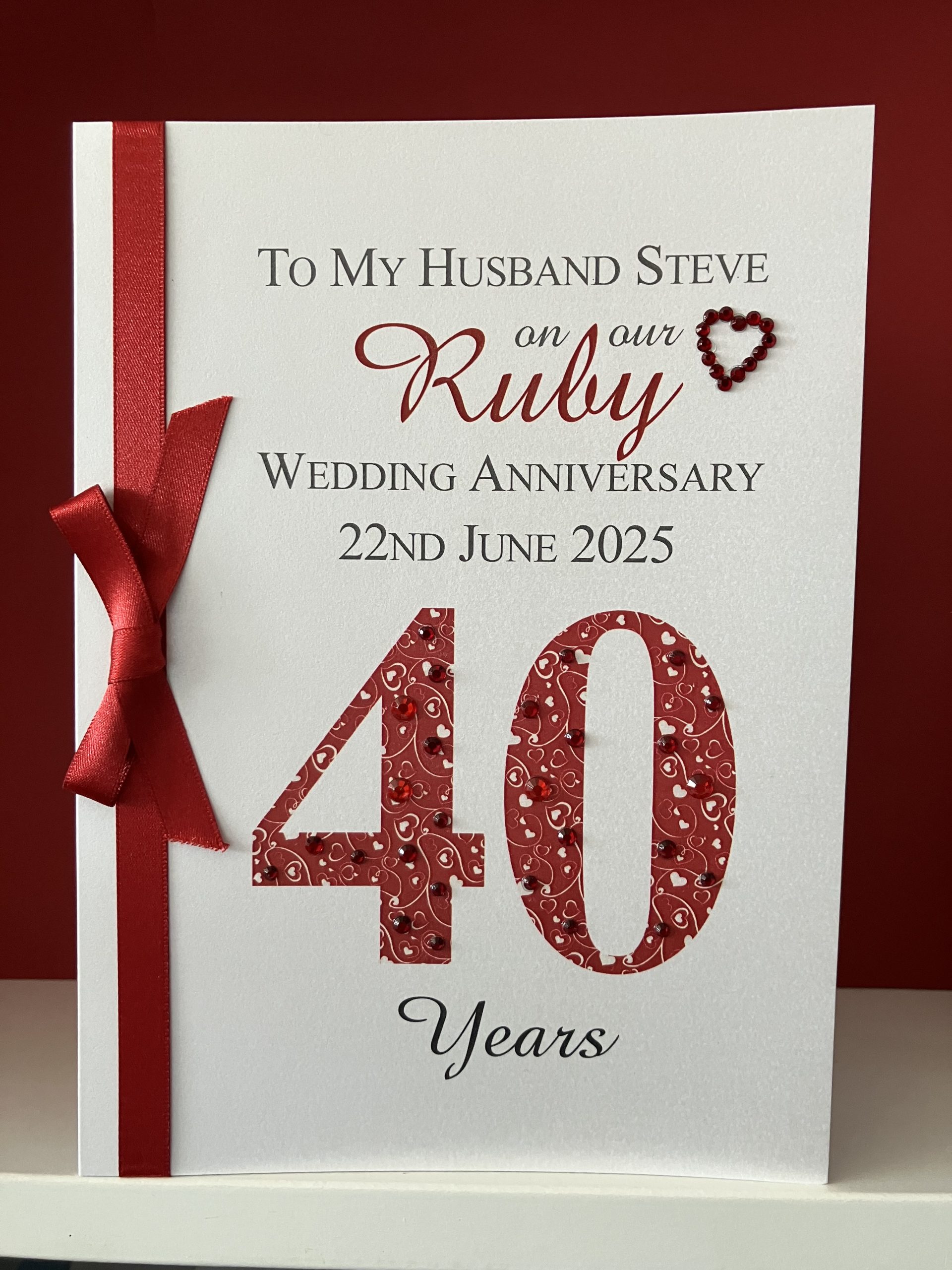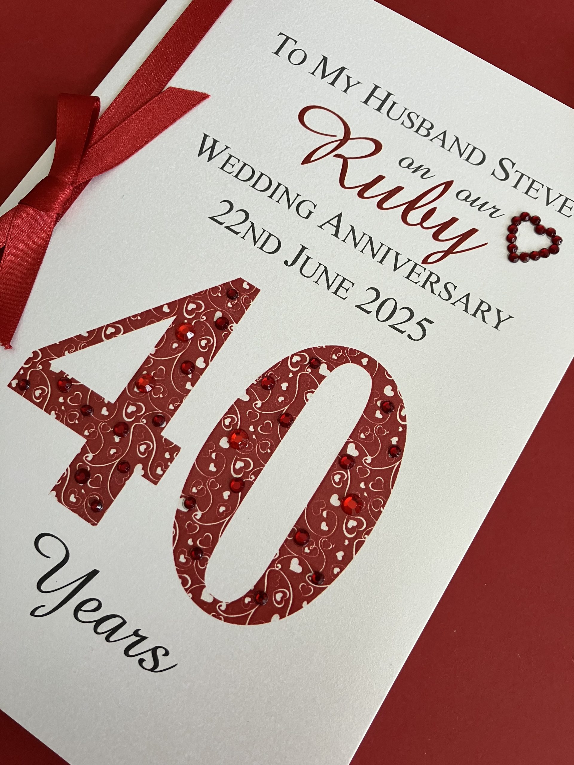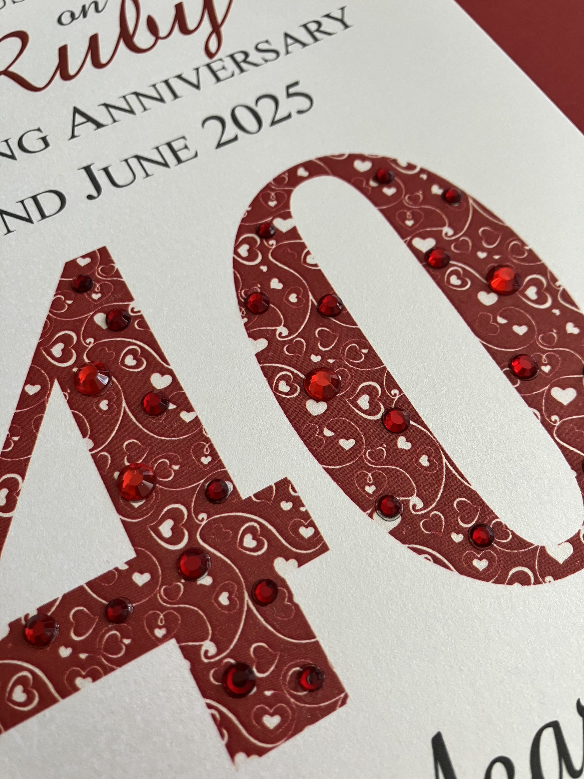 A beautiful keepsake anniversary card for a Ruby (40th) wedding anniversary. Hand crafted to order with the utmost care and attention.